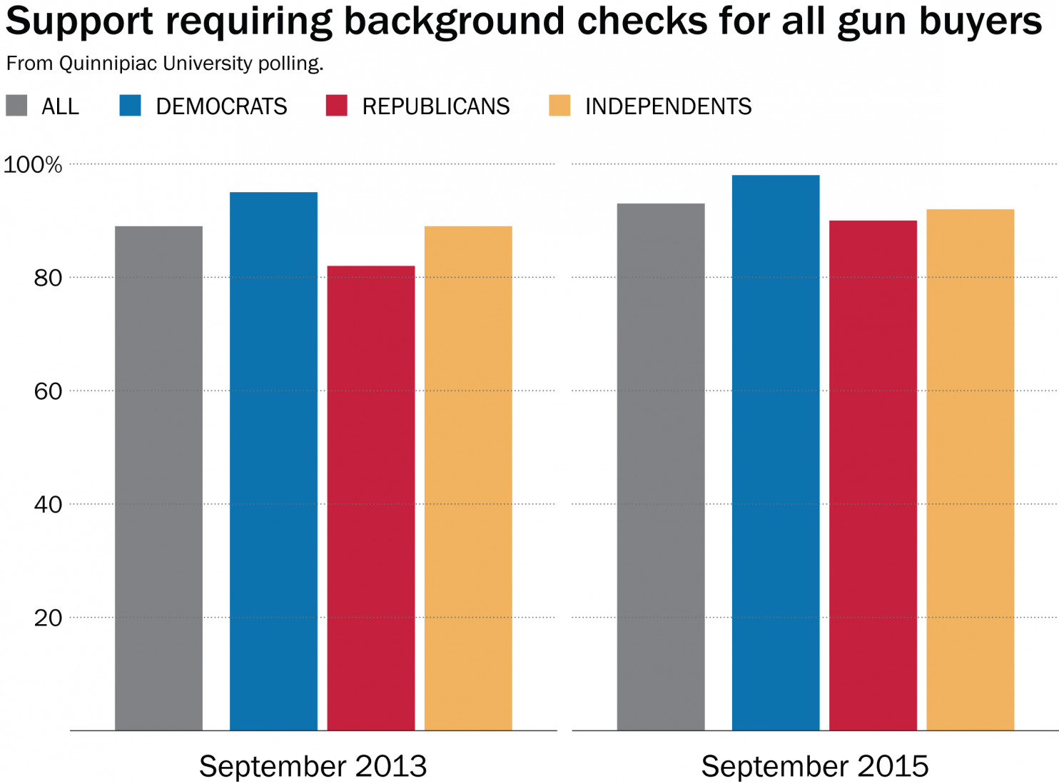 Has there ever been a greater gap between the will of the American people and the actions of their elected officials than on the issue of universal background checks? In a poll released just one week before this week’s gun massacre at Umpqua Community College in Oregon, a Quinnipiac University poll found that 93% of Americans favor universal background checks for gun purchases. And most startling, the high number cuts across the political divide. While more Democrats favor background checks than do Republicans, the difference is a paltry 8% … 98% to 90%.